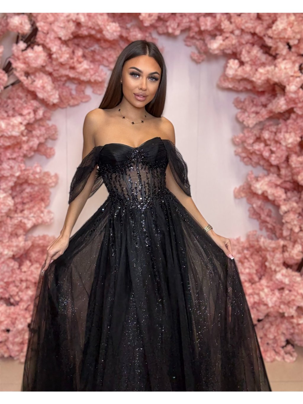 Romantické korzetové šaty podšité třpytivou látkou s vyšívanými květinami. S těmito šaty budete na plese nebo maturitním večírku nepřehlédnutelná. Šaty mají celkem 5 vrstev, z nichž 3 jsou tyl. U těchto šatů je potřeba počítat s tím, že třpytky přirozeně opadávají.