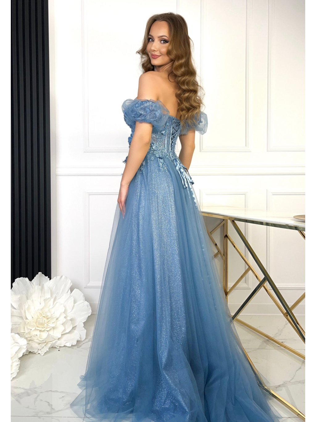 Romantické korzetové šaty podšité třpytivou látkou. S těmito šaty budete na plese nebo maturitním večírku nepřehlédnutelná. K šatům jsou dodávány rukávky, které je možno nosit ja pažích - v případě potřeby je můžete/nemusíte použít. Šaty mají celkem 5 vrstev, z nichž 5 je tyl. U těchto šatů je potřeba počítat s tím, že třpytky přirozeně opadávají.