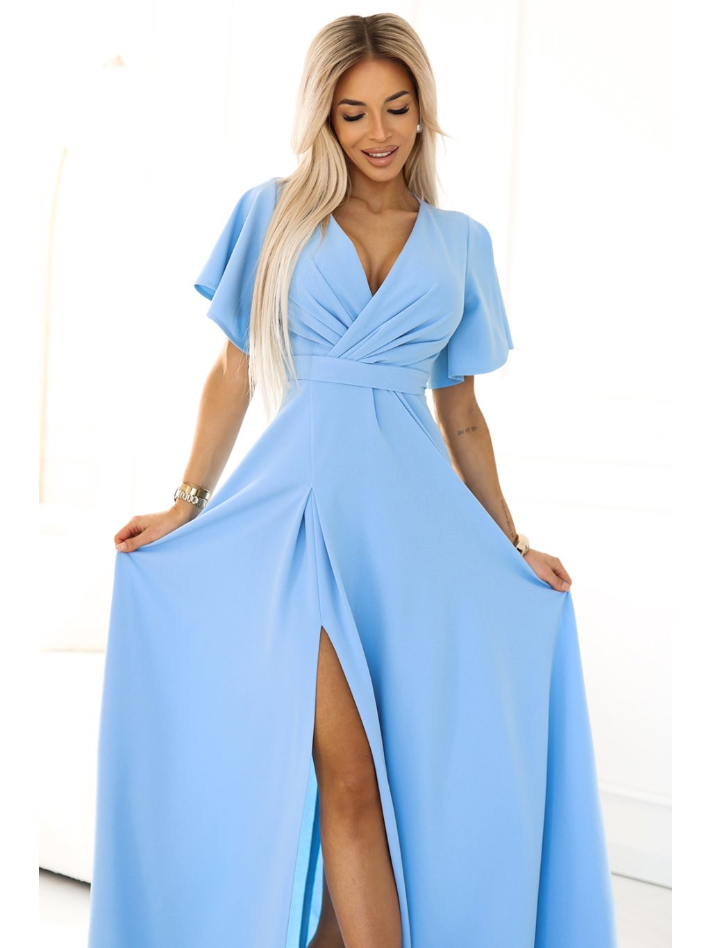 Jednoduché splývavé šaty se vzdušným rukávkem. V pase má modelka pásek, který dostanete v barvě šatů. Modelka je vysoká 179 cm, konfekci nosí 36 a na fotografiích má na sobě šaty Bella ve verzi S