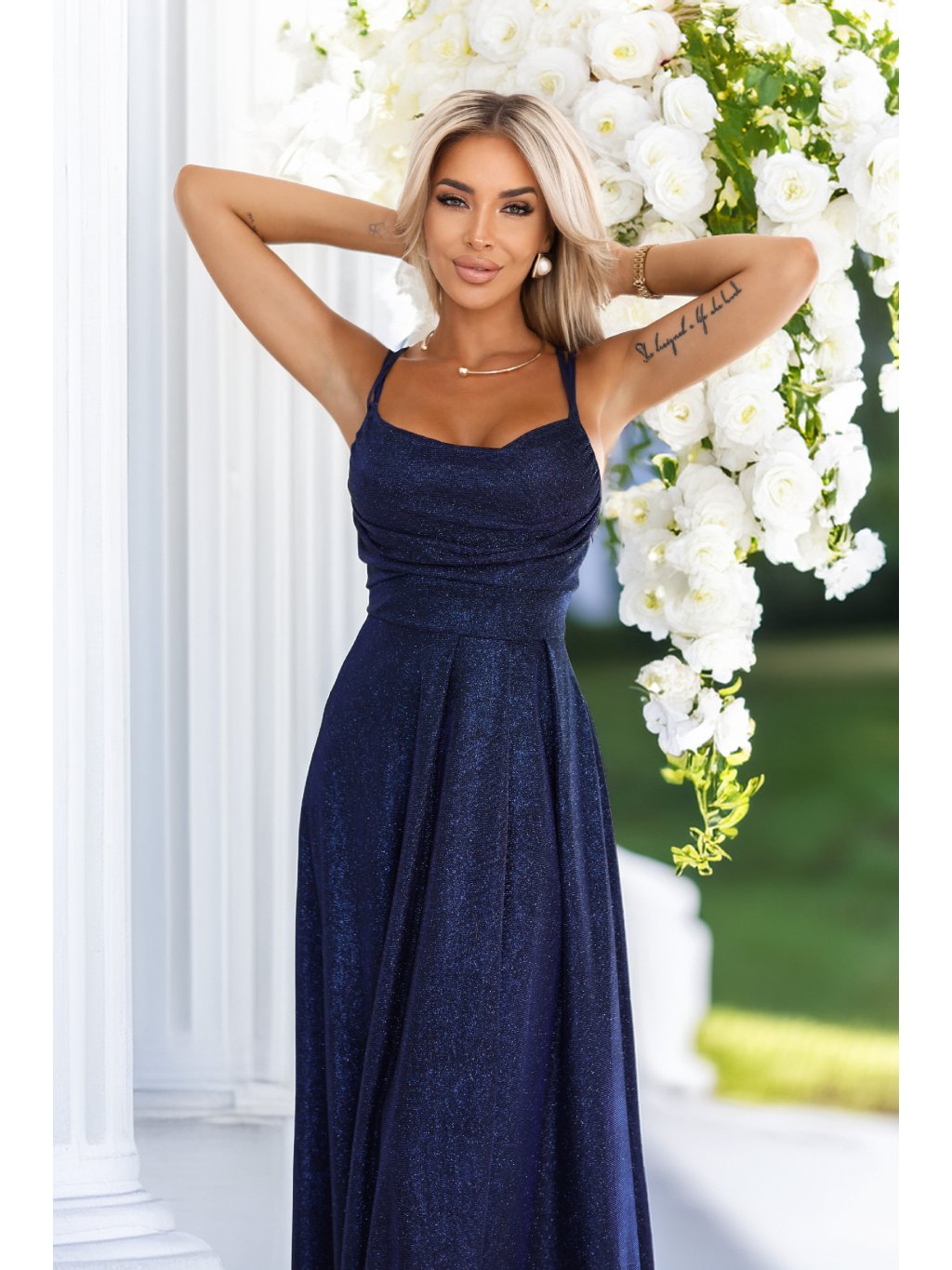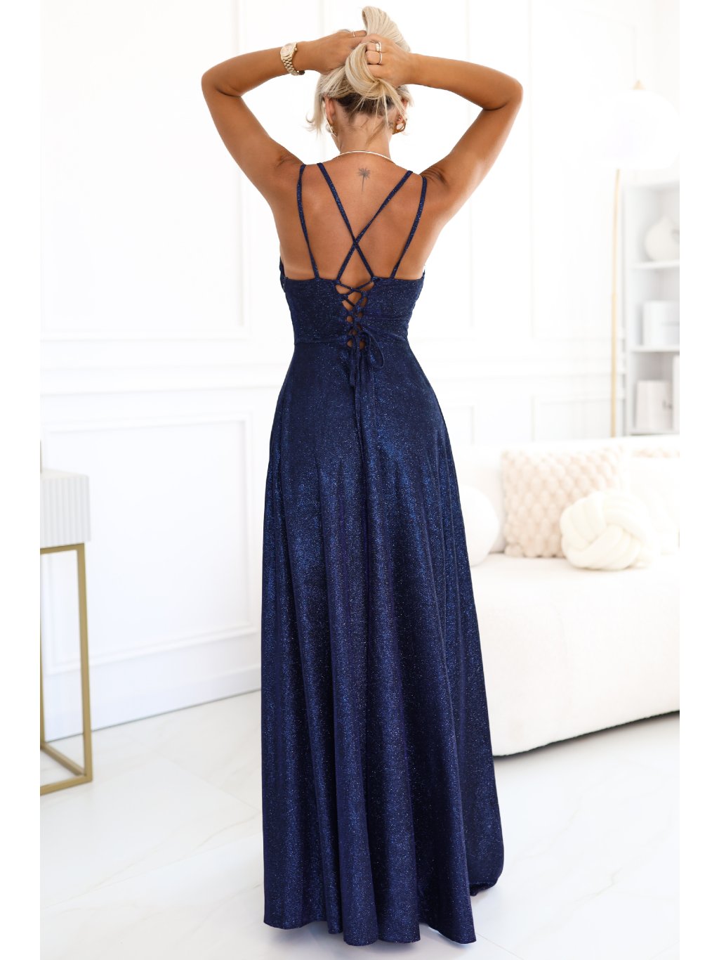 Šaty Valeria s ozdobným a praktickým šnerováním, díky kterému se šaty přizpůsobí postavě. Materiál je třpytivý a mírně elastický. Šaty mají rozparek.