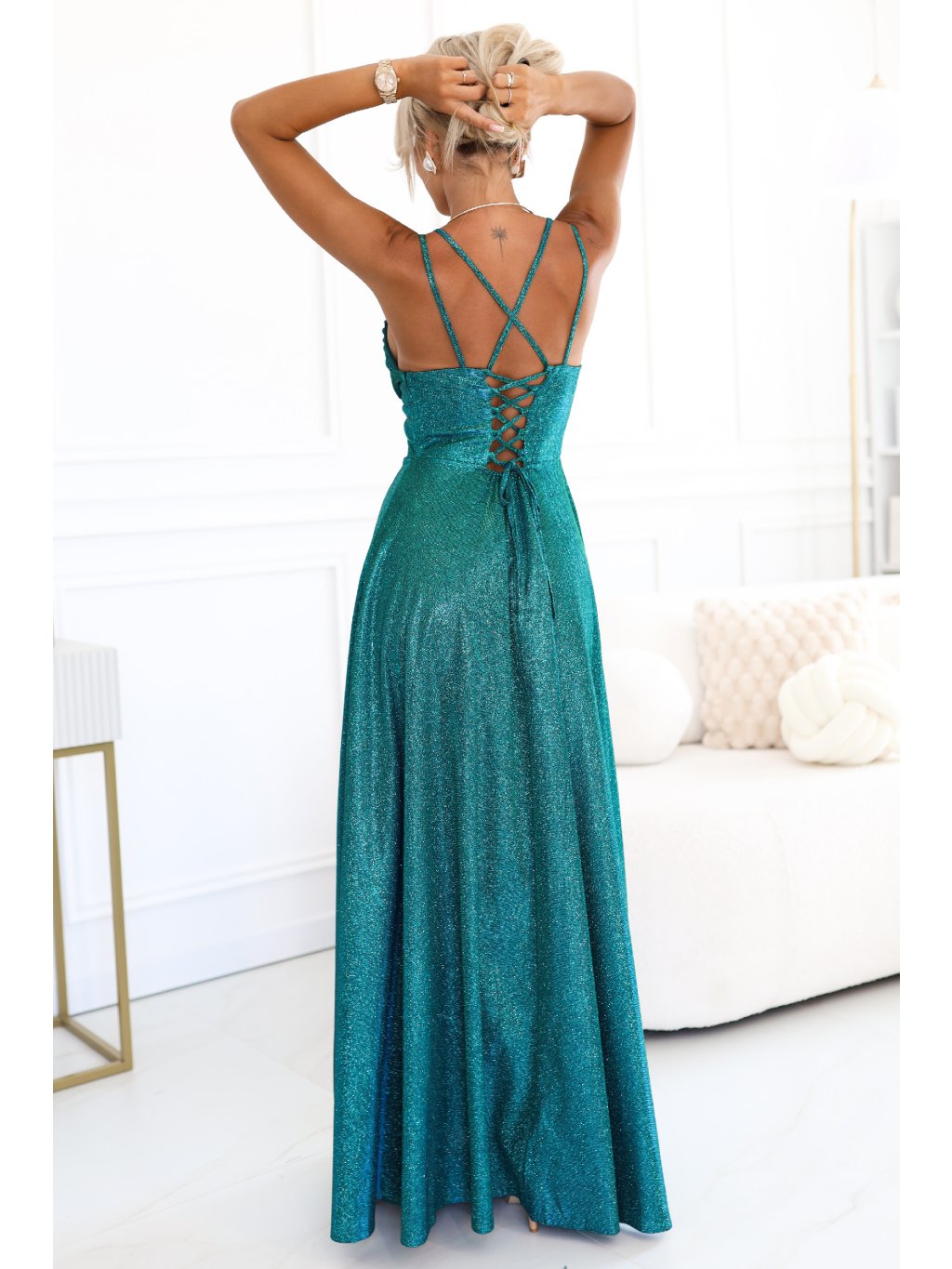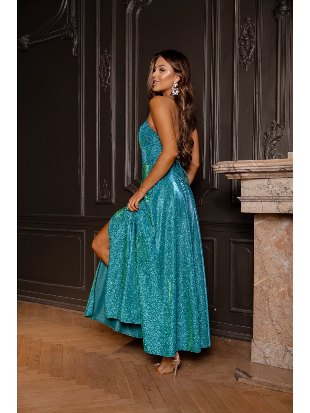 Šaty Valeria s ozdobným a praktickým šnerováním, díky kterému se šaty přizpůsobí postavě. Materiál je třpytivý a mírně elastický. Šaty mají rozparek.